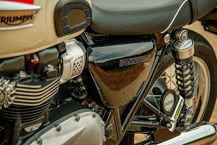 The original T120 was fitted with 8-inch drum brakes with twin leading shoes, which did the job well enough, but the new bike has a 310 mm Nissin disc on the front wheel and a 255 mm disc on the rear, both equipped with ABS, and are in a different class when compared with the original Bonneville’s anchors. One has to consider that the modern bike weighs 215 kg dry, whereas the original bike only weighed about 170 kg, so the extra stopping power is necessary. Everything on the Bonneville is made to look and feel classic retro, but the ride has become very modern and clinical. There is the option to turn off the traction control, but it still feels just too clinical.