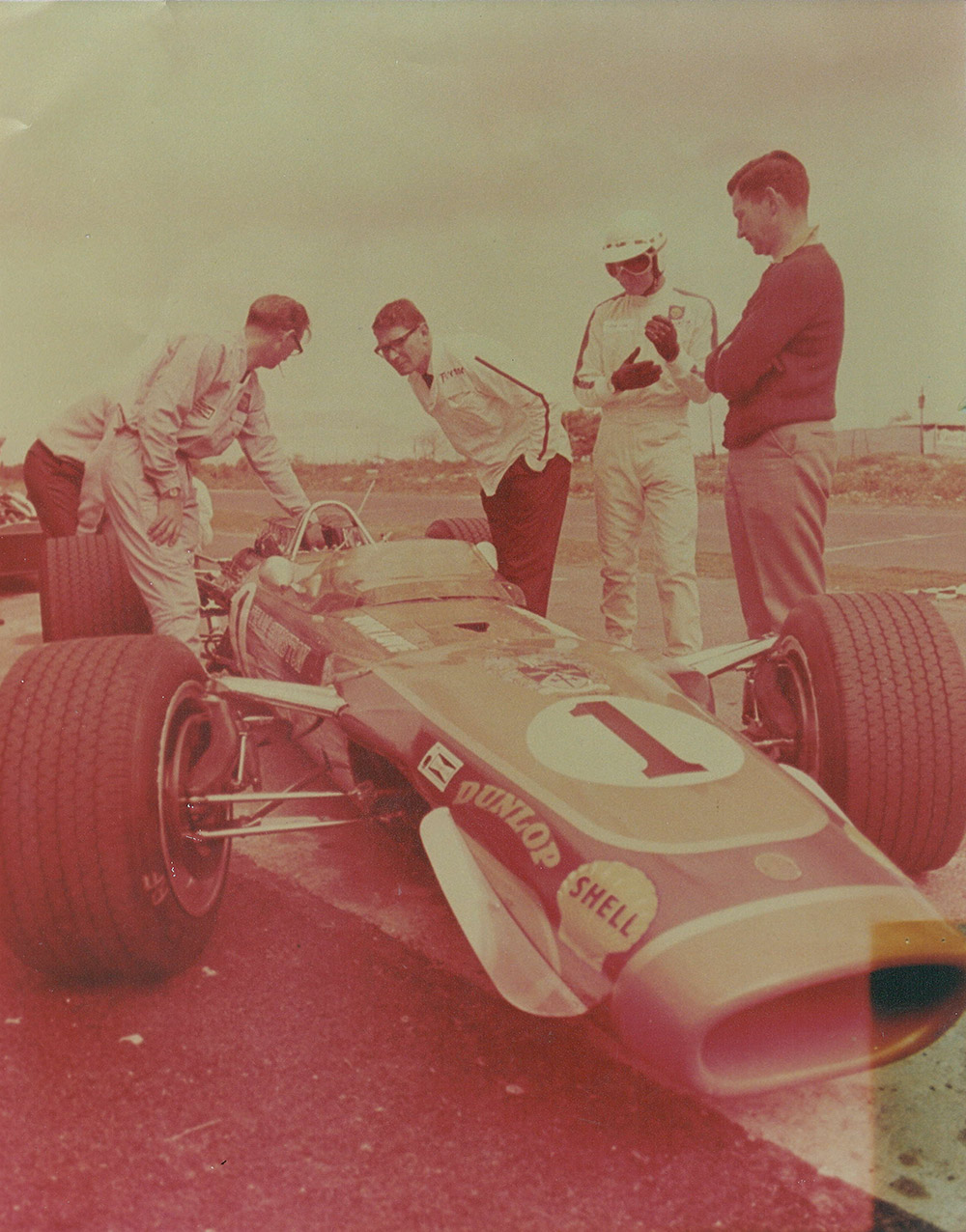 The second photo raises a number of queries. The car is the Team Gunston Lotus 49 of John Love taken around 1969, but can anyone tell at which circuit the photo was taken, please? There is not much to work with, but the lack of a mountain in the background eliminates Killarney. And the bonus question is can anyone identify any of the people with the helmeted Love?