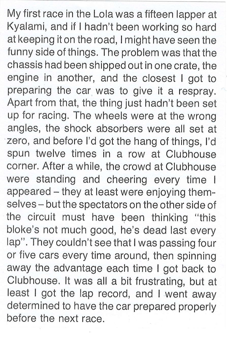 To illustrate the point, here is a picture of Jody in the Lola leading Richard Sterne, Peter Hull and Mick Formato through Clubhouse Corner at Kyalami. The race was the first of the five that took place on successive weekends and to bolster the competition, drivers came from overseas to take part. And at the end of the series, Jody was the highest placed South African, which meant he won a Racer To Europe sponsorship. In March he was on his way to the UK and the rest, as they say, is history…