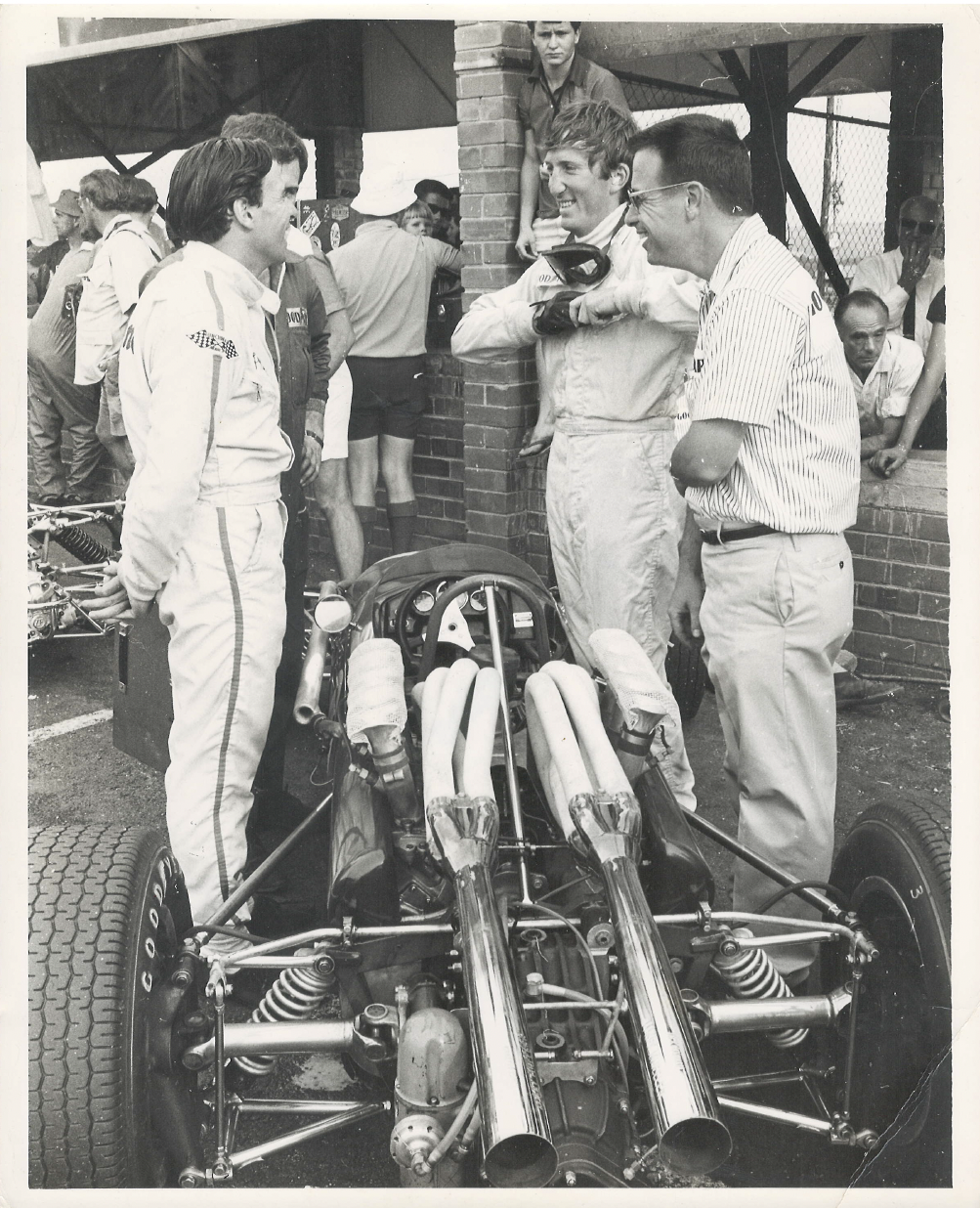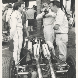 Jim Clark and Jochen Rindt having a laugh in the pits at Kyalami during the 1968 SA GP.