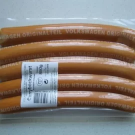 Volkswagen currywurst is a brand of sausage manufactured by the car maker since 1973. It is manufactured at the company’s Wolfsburg plant and sold in restaurants in its six German factories. The currywurst is also sold externally at supermarkets and football stadiums and given away to Volkswagen customers. The sausage is branded as a ‘Volkswagen Original Part’ and has been given the part number 199 398 500 A. The product has been described as the most produced of any of Volkswagen’s parts, some 6,81 million sausages being manufactured in 2018. In many recent years, the company has produced more sausages than cars.