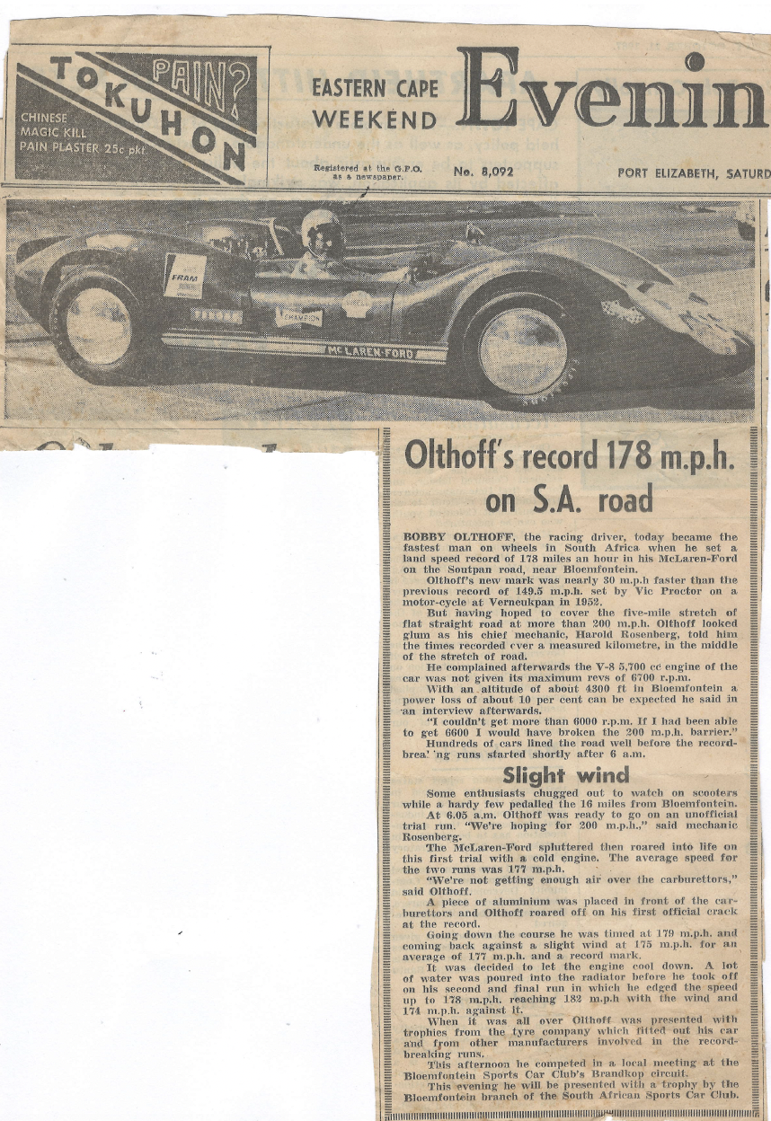 Fifty-five years ago, South Africa’s land speed record was broken twice within a couple of months. At the time, the record of 149,5 mph (240,59 km/h) had been set by famed motorcyclist Vic Proctor at Verneuk Pan in 1952. On 21 October 1967, famed SA racing driver Bobby Olthoff took his 5700cc V8 McLaren-Ford to a flat (a gradient rise of only 0,1%), eight-kilometre stretch of the Soutpan Road near Bloemfontein to try and beat the record. However, although the stretch of road was not ideal because at an altitude of over 1 300 metres a power loss of around 10% was the order of the day – Bobby couldn’t get the car past 6 000 r/min, some 6 000 r/min down on maximum revs. Nevertheless, a trial run over the measured kilometre realised a two-way average of 177 mph (284,85 km/h). A modification was made to help force more air over the carburettors and the first official record run saw Bobby repeat his trial run average. Not satisfied with this, a second and final run was made that realised 182 mph (292,90 km/h) with the wind and 174 mph (280,02 km/h) against it, for a new record average edged of 178 mph (286,46 km/h).