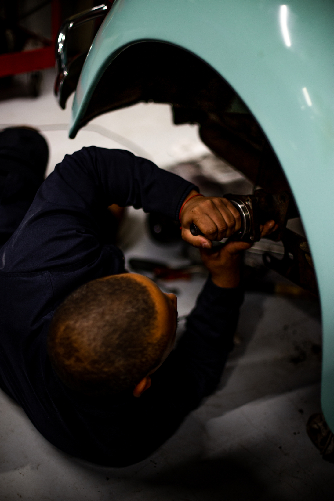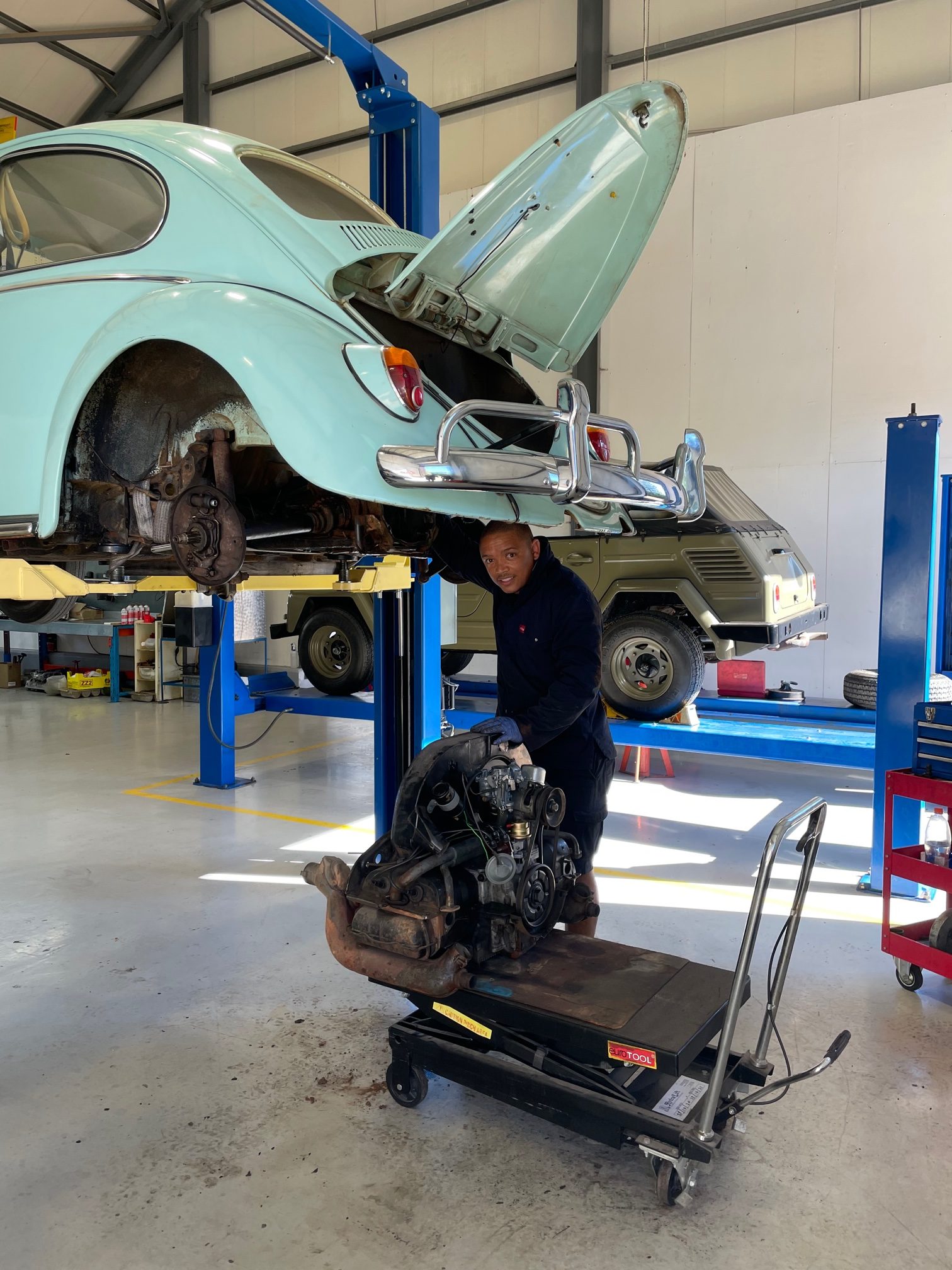 The 1966 Beetle is an untouched, original example. It had not run in years, and the windows had turned black from being too long in the sun. The fuel tank was corroded badly, the brake cylinders needed attention and the gearbox had an oil leak. Firstly, Wenstley Wicomb took on the task of preparing the engine for starting. He then tackled the brakes and found one wheel cylinder to be completely seized. A new one arrived with the other parts and the other existing cylinders were honed and new cup washers fitted. The gearbox leak was quite a job. At first, Wenstley thought that it was only a transaxle boot, which he replaced. The next morning, however, there was oil on the floor on the same spot. So he thought it must be the gearbox casing gasket. This meant the engine had to be removed so that the gearbox could be removed to replace the gaskets and correctly adjust the spacing. With everything open, the opportunity was taken to replace all other seals and the clutch was inspected. Once the engine and gearbox had been cleaned up nicely, the drivetrain was reinstalled. Then it was time to test the car, and with the engine already prepared earlier, it was a simple task to get it running. After all the hard work, Wenstley’s smile after the test drive was a picture!