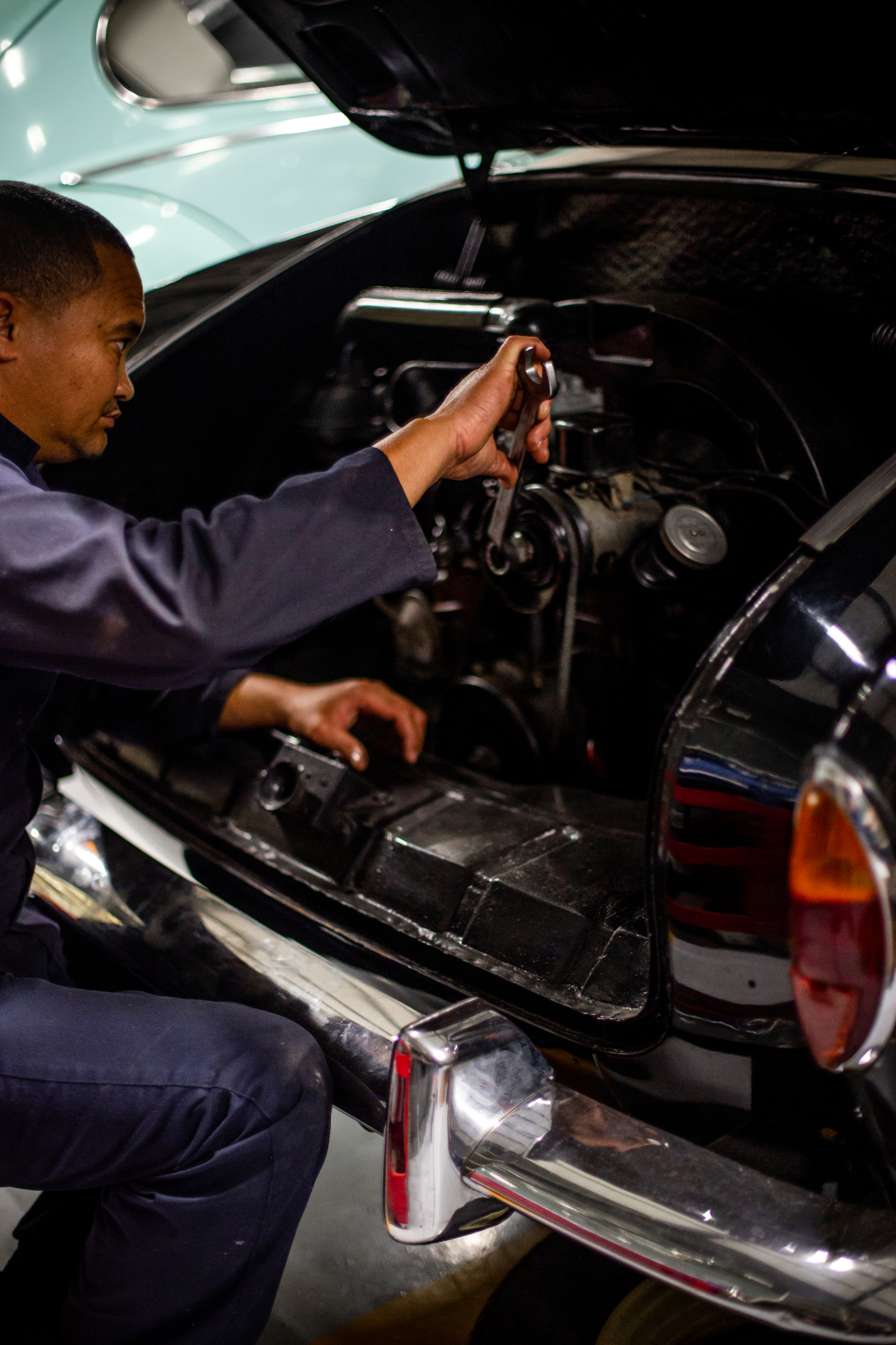 The 1959 Karmann Ghia was also not known to have run for some time and had some chrome trim missing. Donnie Tarentaal set about getting the base timing and carburettor settings on point. Then the brakes were attended to. After some discussion, it was determined that a simple hone of the wheel and master cylinders along with new cup washers would suffice in this case. Michael van Graan helped out with fabricating and polishing some trim to replace the missing items. A test drive ensured that the sleekest design amongst the museum’s VWs was ready for action.