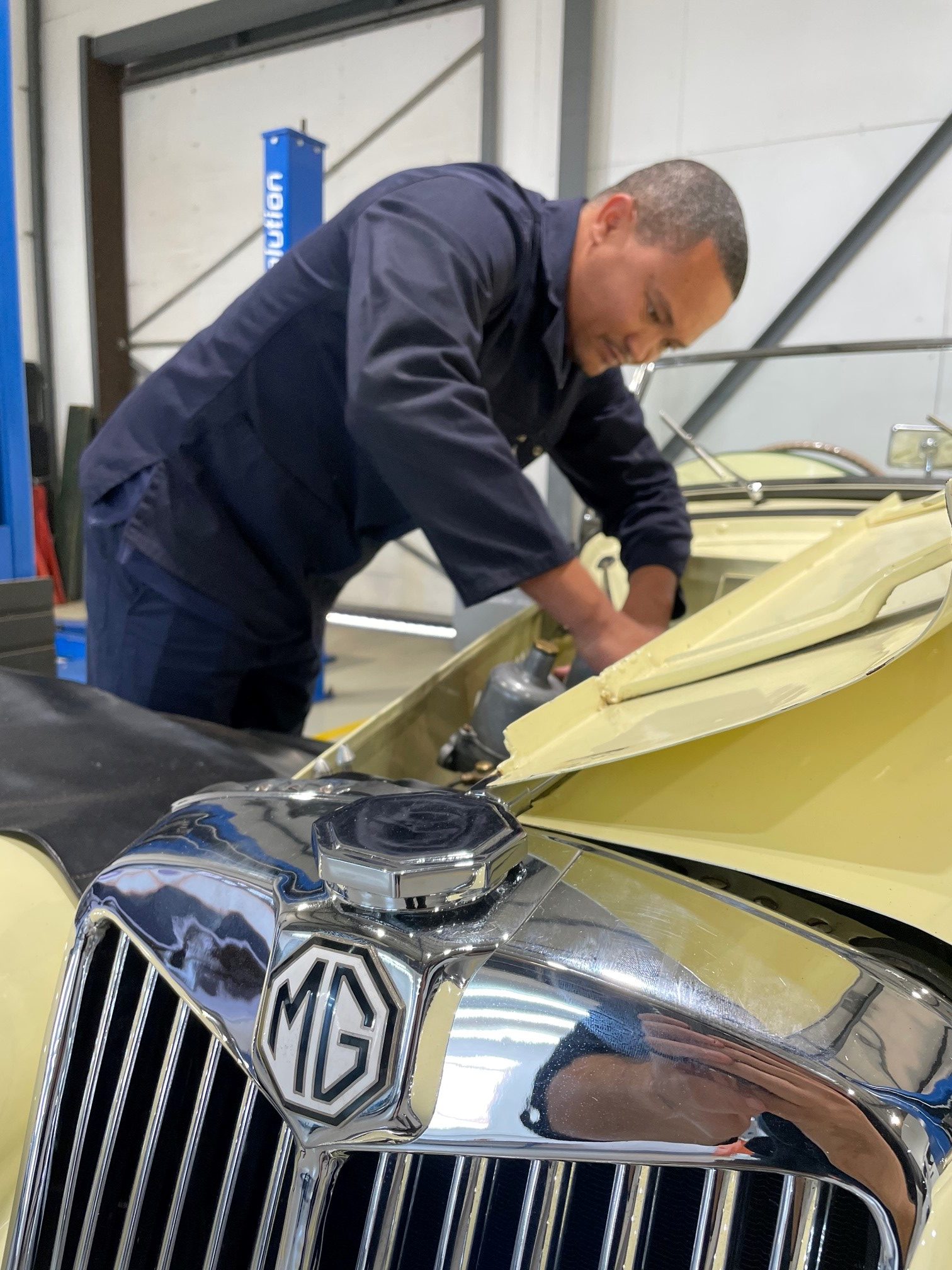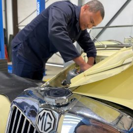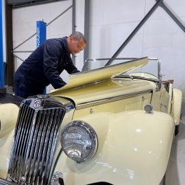 With the engine fully assembled, it was time to reinstall it to the vehicle. This is always a team effort, especially with older cars and their narrow engine bays. Once installed, the overhauled SU carburettors were fitted and the time had come to start up the TF. Everything went smoothly, and after running checks in the workshop and final tuning of the carburettors, Donnie took Wenstley along for the first run. Needless to say, they returned with big smiles!