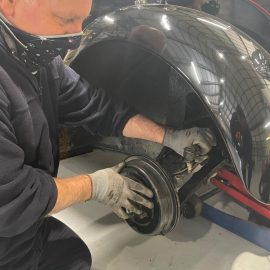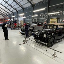 With the rubber steering coupling on the museum’s Mercedes-Benz 130H recently replaced, wheel alignment was required to ensure proper tracking. Workshop manager Lorenzo Farella took the time to show the team how to ‘string’ the car. The method requires four jack stands, weights, a ball of string and a tape measure. Or a builder’s line and a Vernier caliper in Lorenzo’s demonstration.