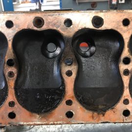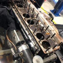 Fluids were drained and safely disposed of then all equipment attached to the head was taken off, along with anything that might get in the way while removing the head. The head nuts were carefully loosened inversely to the fastening sequence. With help from the rest of the team, the gasket came off with the head as we lifted it off the block, and once on the work bench it could be seen that it had blown through two chambers. But the bigger problem was the engine not turning.