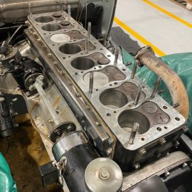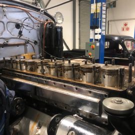 Work started by removing the spark plugs to inspect the compression chambers with the bore scope, but with the engine being a flat-head straight-8, it was difficult to get the camera turned 90˚ one way and again the opposite way. This meant that the cylinder head had to be removed while keeping the engine in the car to disturb it as little as possible.