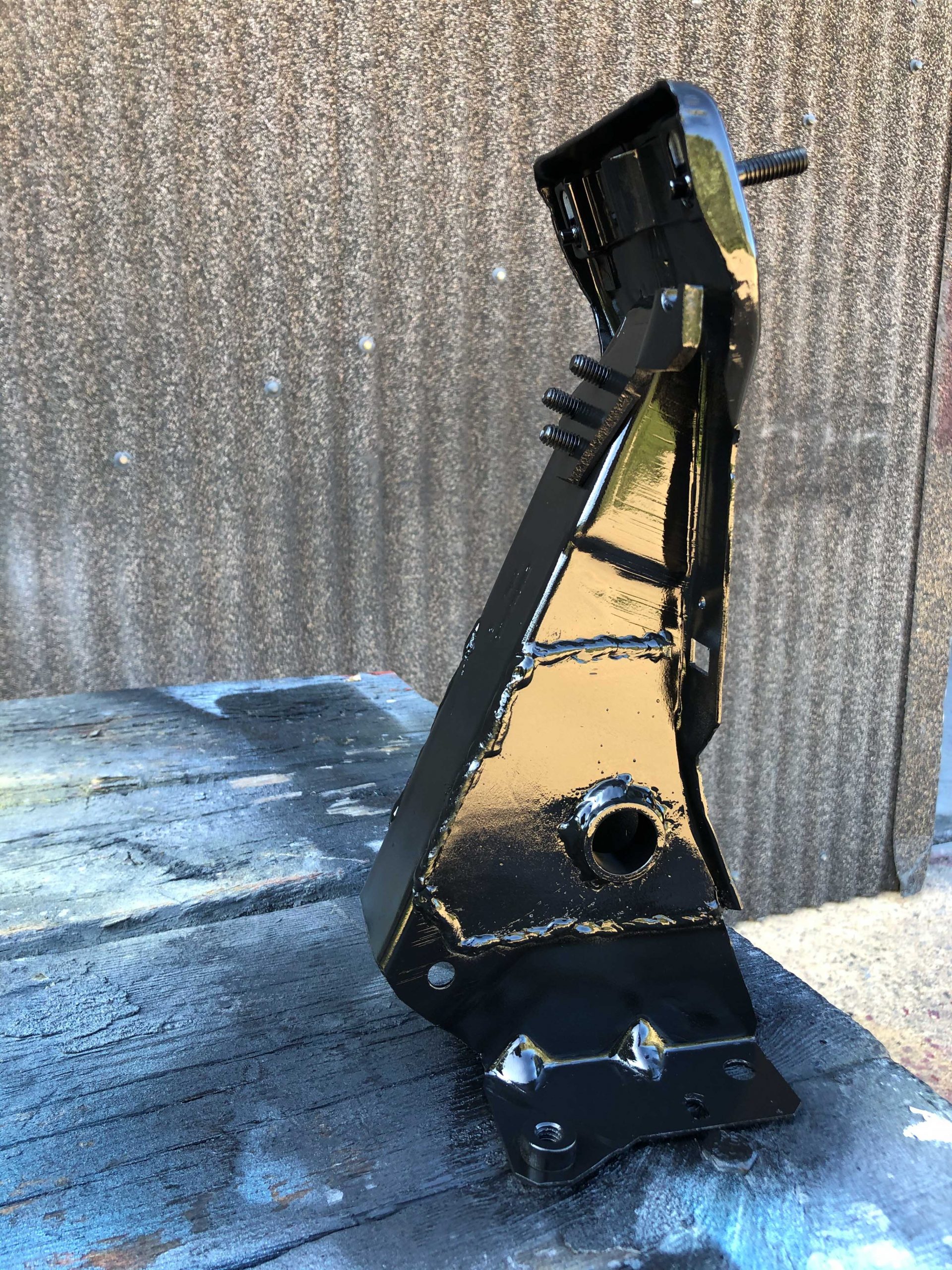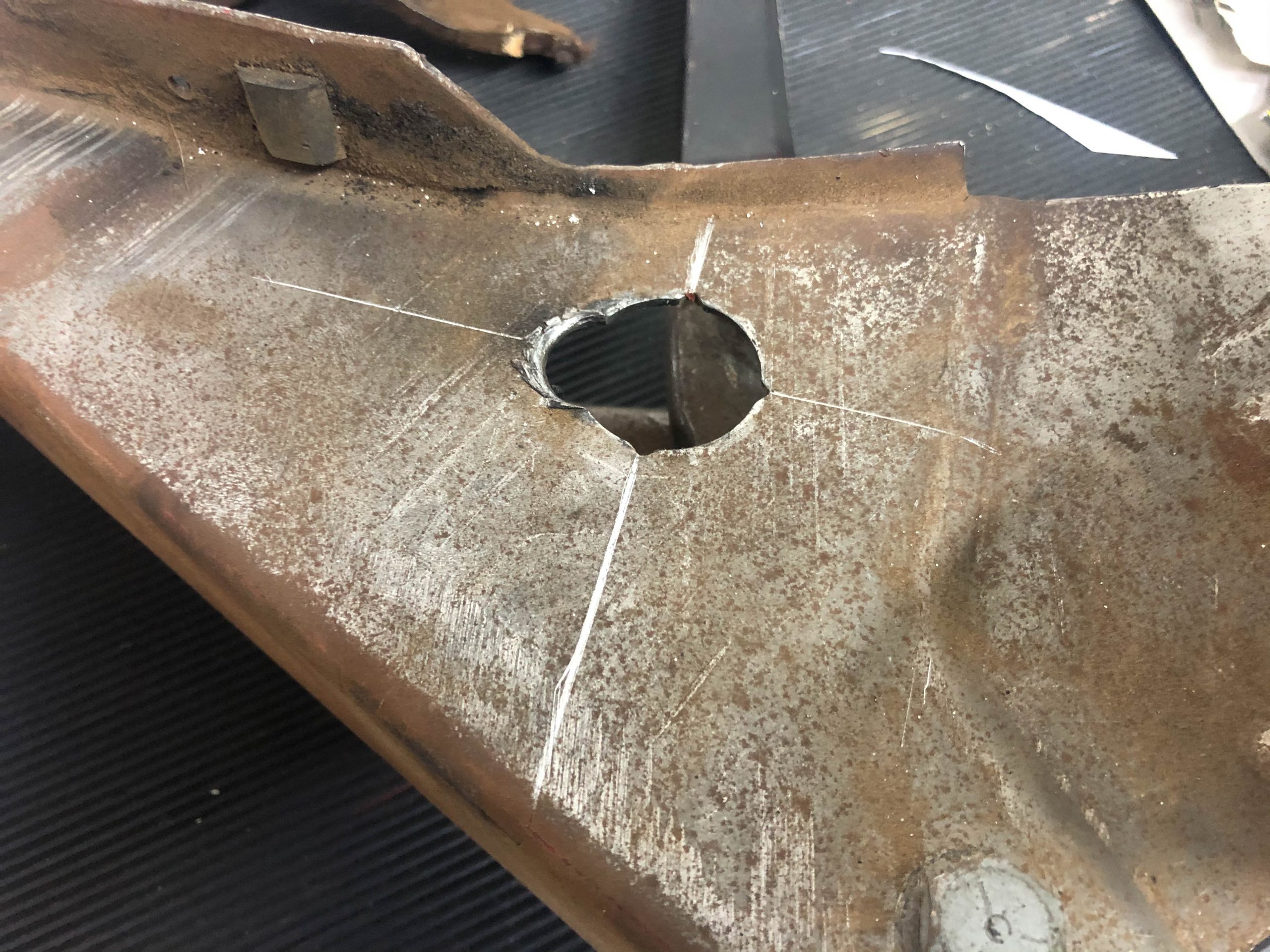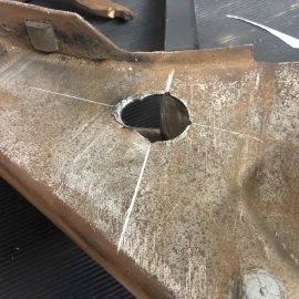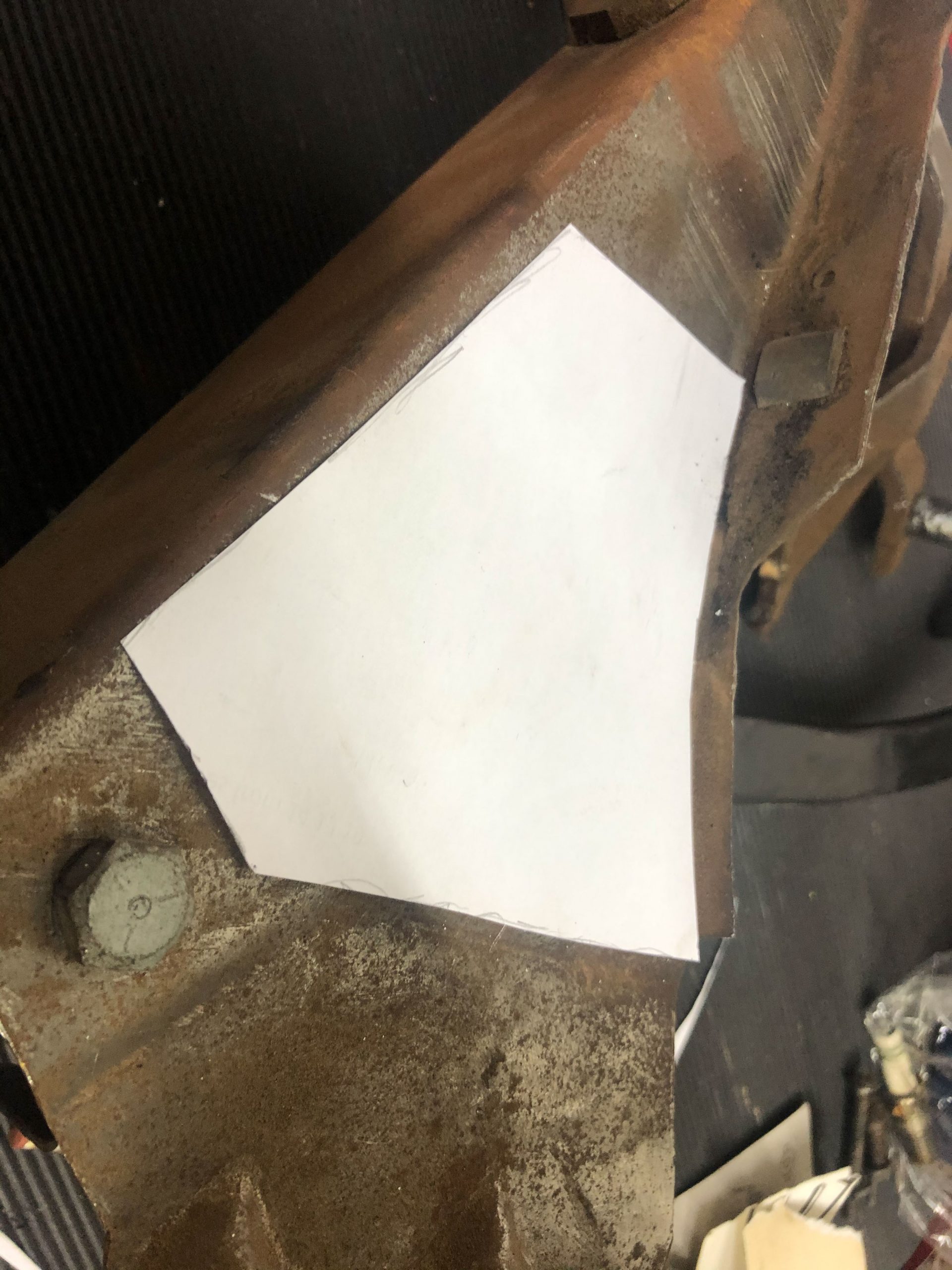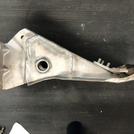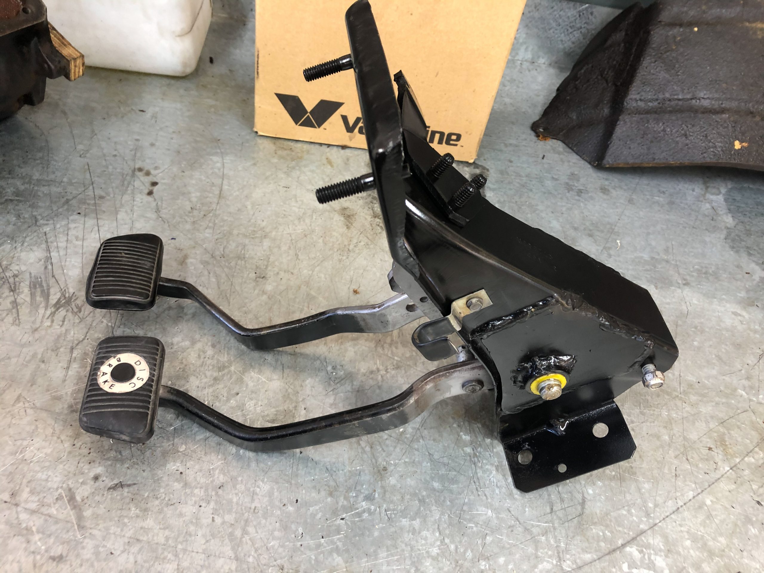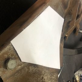 Once out, the entire pedal assembly was assessed on the bench and a plan of action was devised. First, the paint was stripped off the mounting bracket and the rust removed. This is the base of the pedal operation and needs to be aligned perfectly, and be strong enough to withstand the countless cycles of pedal depressions. So, gusset plate templates were drawn up on paper, measuring carefully to ensure alignment of holes. The paper templates were then fabricated in 3mm steel plate and welded onto the mounting bracket.