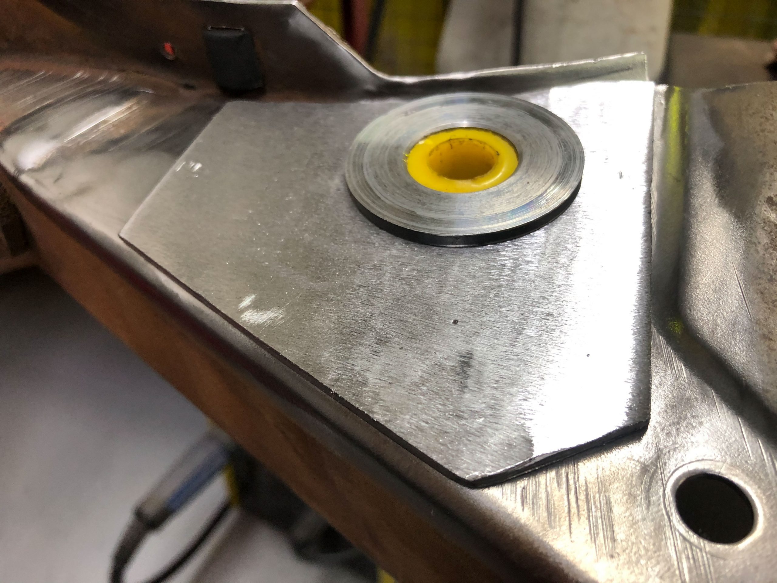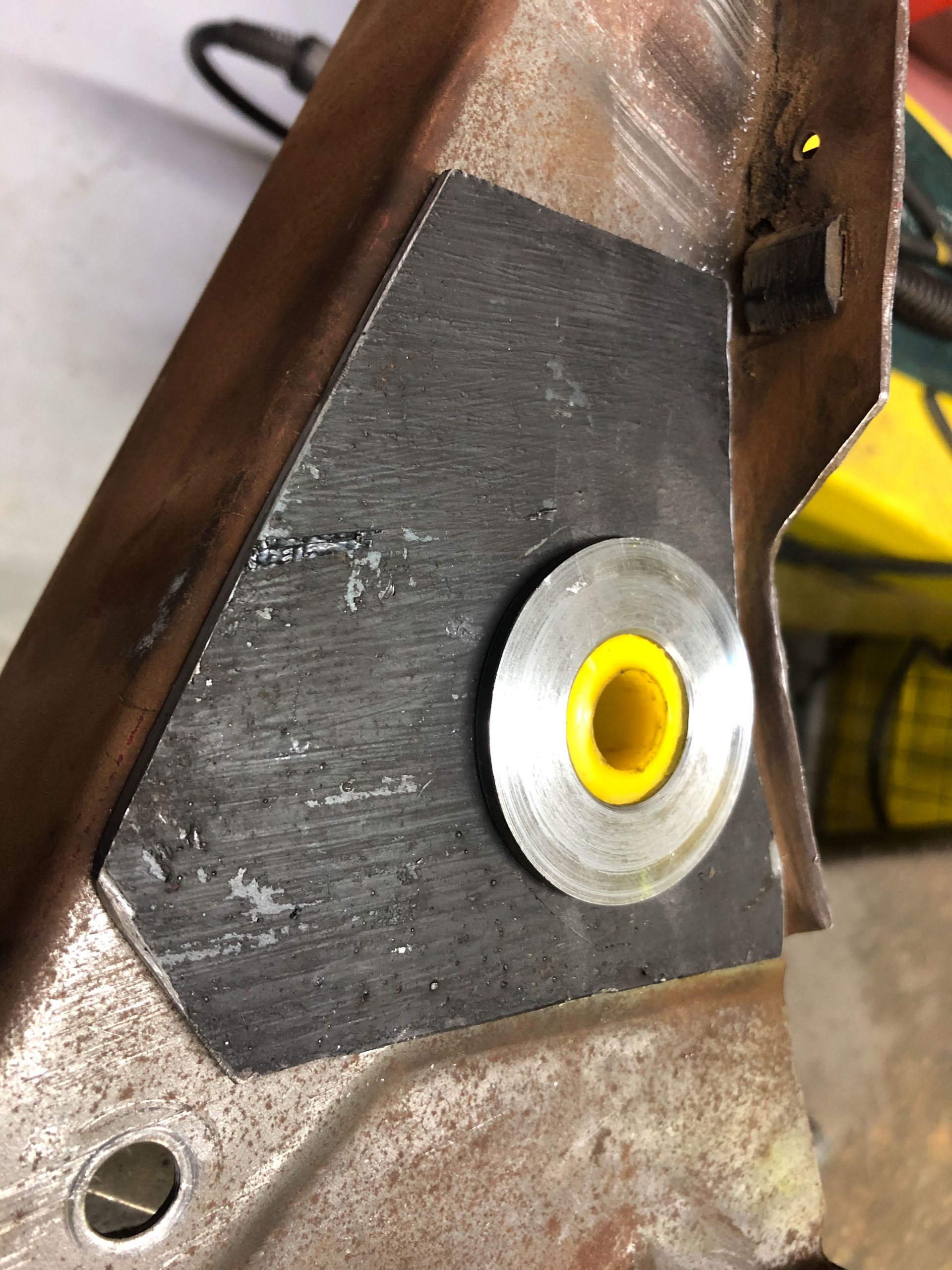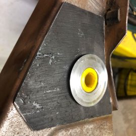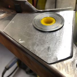 Then new, thicker cross-section metal top-hat bushes were turned on the lathe and welded into the holes on the mounting bracket, while keeping the inner diameters aligned as much as possible. With welding, metal always pulls to some extent, so one has to compensate for that when measurements are crucial. After the metal bushes, thicker nylon inner bushes were turned on the lathe. These are the ‘damper’ bushes that interface the pedal pivot shaft to its mounting bracket.
