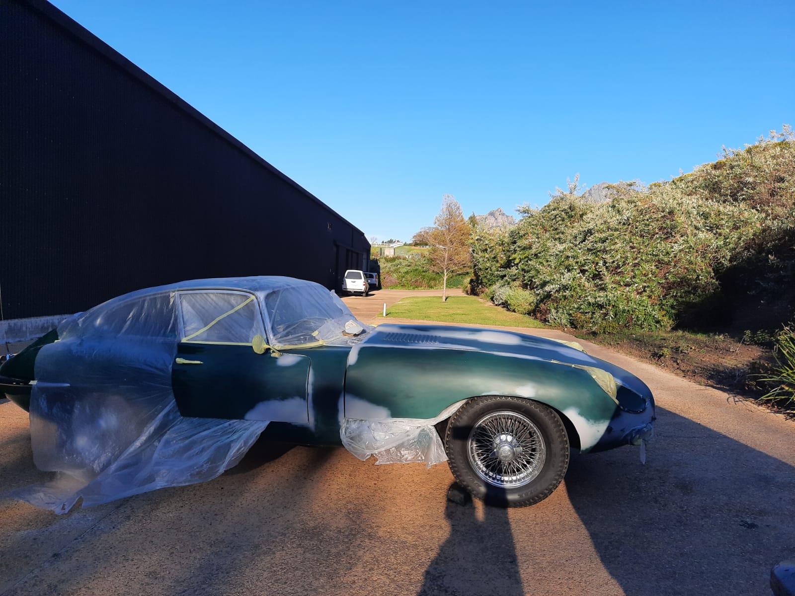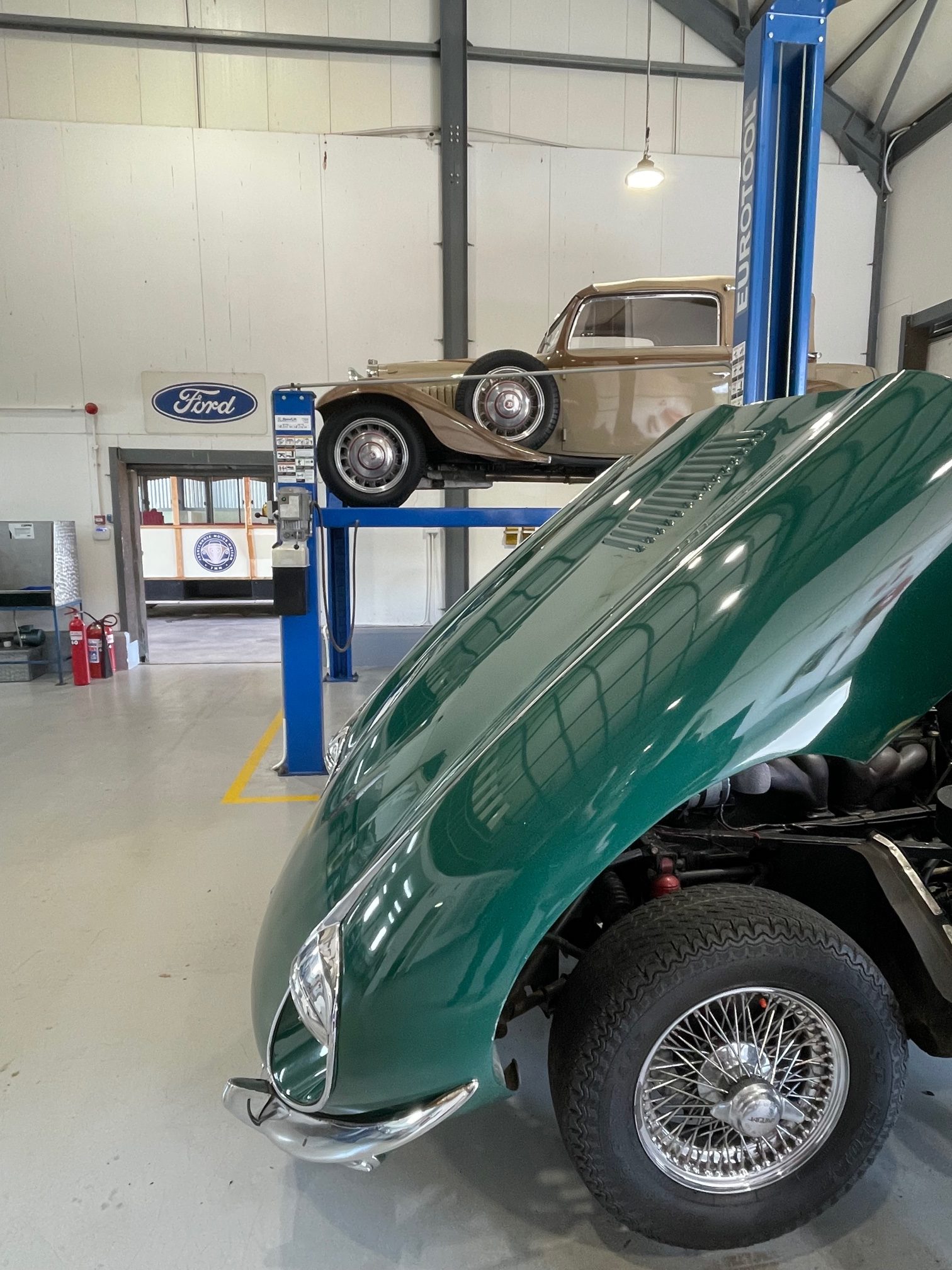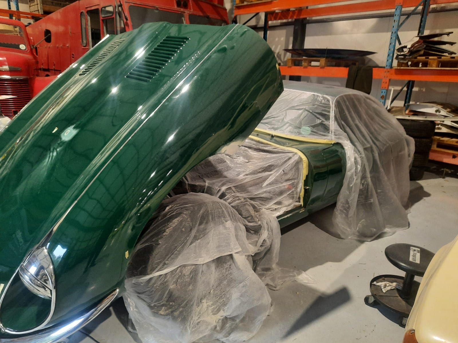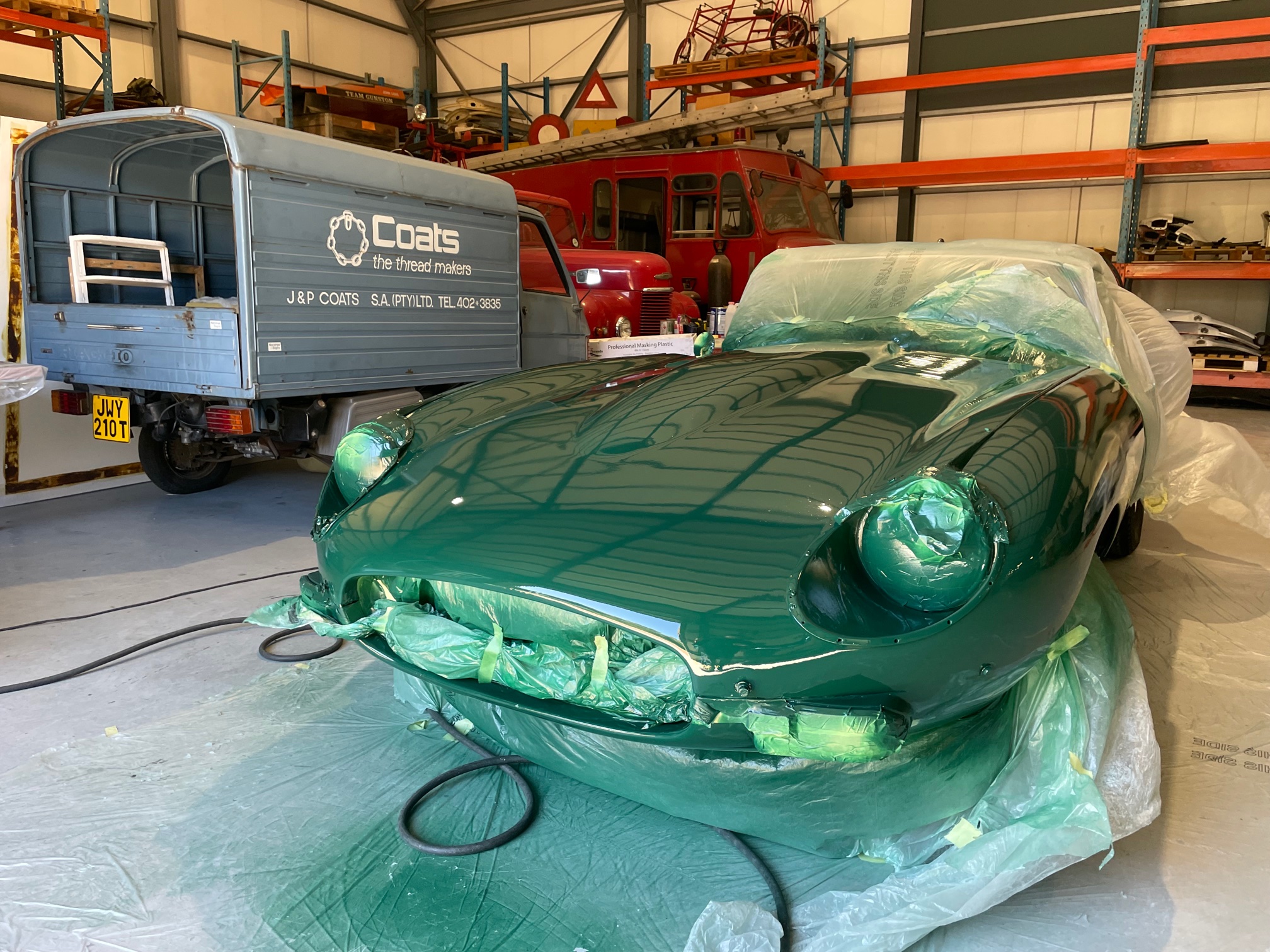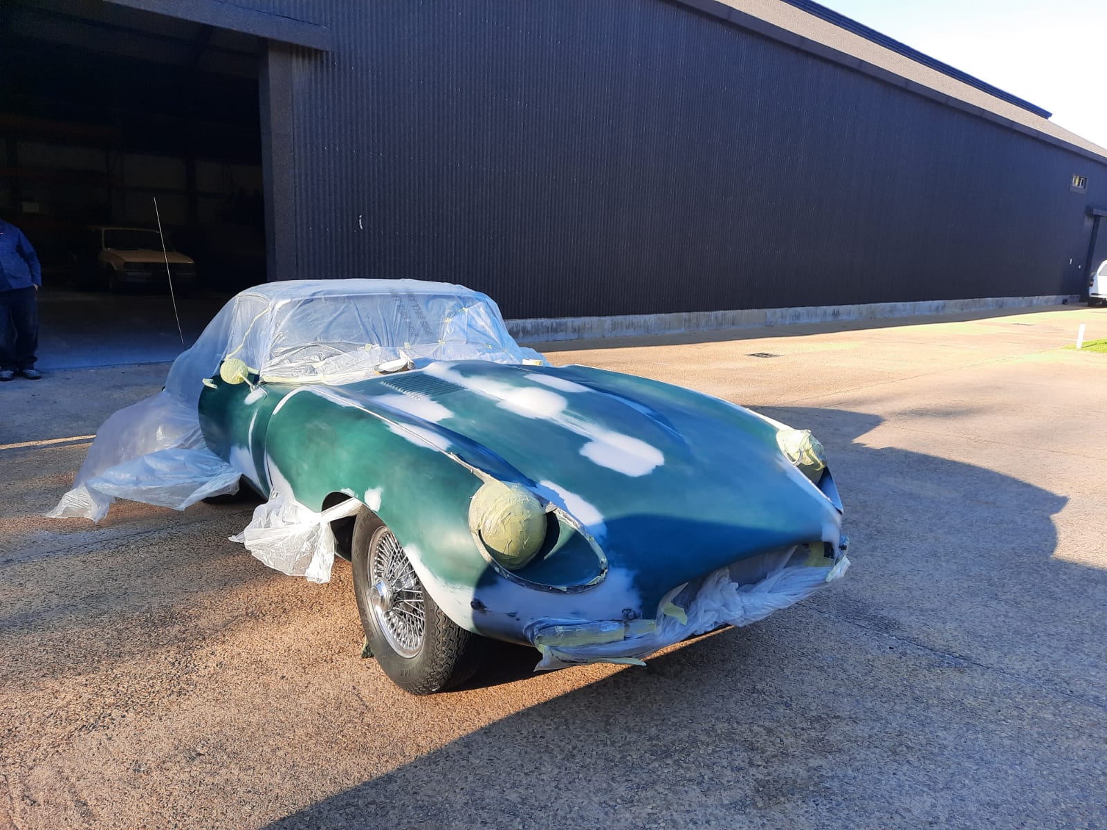 As many of you will know, the forward-hinged bonnet of the E-Type makes up a lot of the car’s bodywork, and is arguably the prettiest feature of the car. So it was imperative that it gets the love it deserves. Michael began with removing the front bumper and taping-up the minor trim items and headlights for protection. After much sanding down and surface preparation, the primer layers were sprayed on while the top coat British Racing Green paint was being mixed according to the fuel flap colour sample.