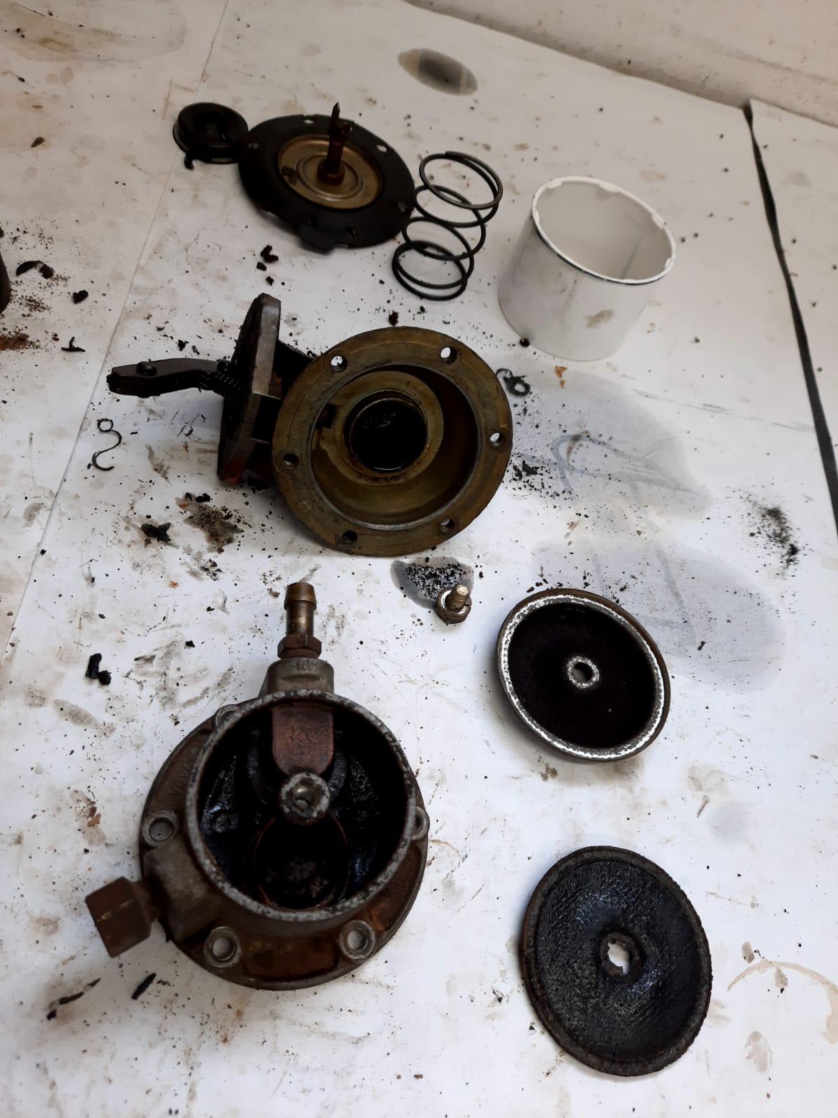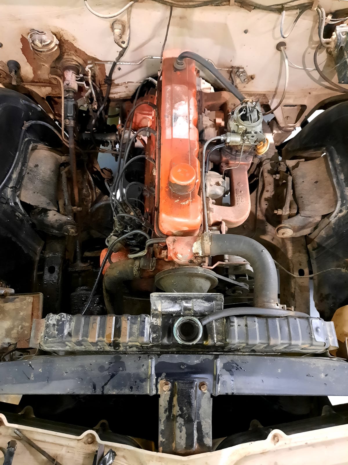 With a car having stood for such a long time, a big concern is the fuel supply. The fuel tank may have drawn water, rusted and become blocked from all the years of disuse. So, to test, a temporary fuel can was set up to gravity-feed the carburettor to try to start the car. After a few tries the car started, but there was a bad leak from the carburettor, which was then removed, cleaned and a new gasket kit fitted.