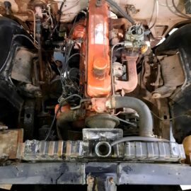 Another big concern of a car that hasn’t run in a long time is the cooling system. Water and metal left over time is always a bad idea. So, it was decided to cleanse the cooling system with radiator flush, while the old hoses were still on the car. After this, the water and flush chemicals were drained and washed out by cycling water from the reclaimed water system at the workshop. New hoses were then fitted and more modern, corrosion resistant coolant was added to the radiator. A new fuel line with an in-line filter was made up to run to the fuel tank at the back. The fuel pump was also refurbished with a new Hypalon diaphragm.