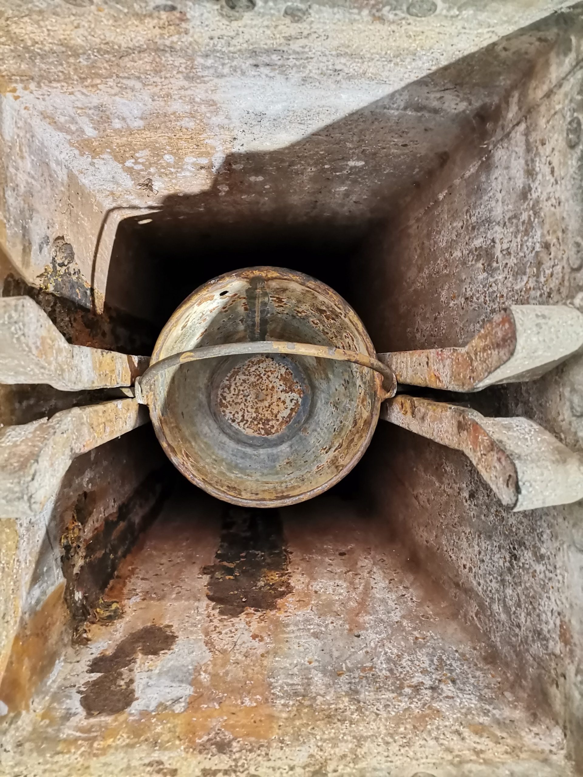 Inside: A bit rusty, but the bucket and storage system can be seen.