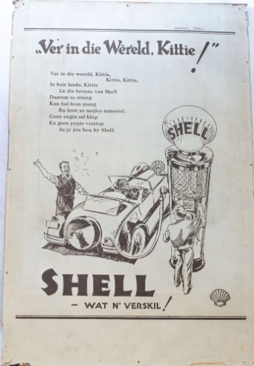 In the latter vein, the museum is fortunate to have a number of Shell advertising items dating back to the 1930s in its collection of memorabilia. They are large, black-and-white poster boards that have a uniquely South African flair to them in the use of colloquial Afrikaans rhymes and songs. Lyrics to Jan Pierrewiet and Ver in die Wereld Kittie have been changed to incorporate the idea of travel and motoring, with the use of Shell being the common denominator in a successful trip.