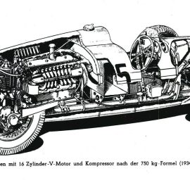 Ferdinand Porsche (b.1875) was a self-taught automotive engineer who received an honorary doctorate from the Vienna Technical University. He was a brilliant innovator and, amongst many other achievements, the designer of the Volkswagen Beetle. In 1933, the Hitler government offered a 500 000 Reichmarks subsidy to a company that would design and build a grand-prix-winning race car for Germany. Daimler-Benz won the award, while Auto Union (using Porsche’s design) lost, but Ferdinand managed to convince Hitler to finance both designs. The Auto Union featured a 4,5-litre V16 engine mid-mounted in an aluminium tube frame. It was a “fearsome race car” which produced 650 horsepower (485 kW) and could spin its wheels at 100 mph (160 km/h). It won numerous races and its reputation endures to this day.